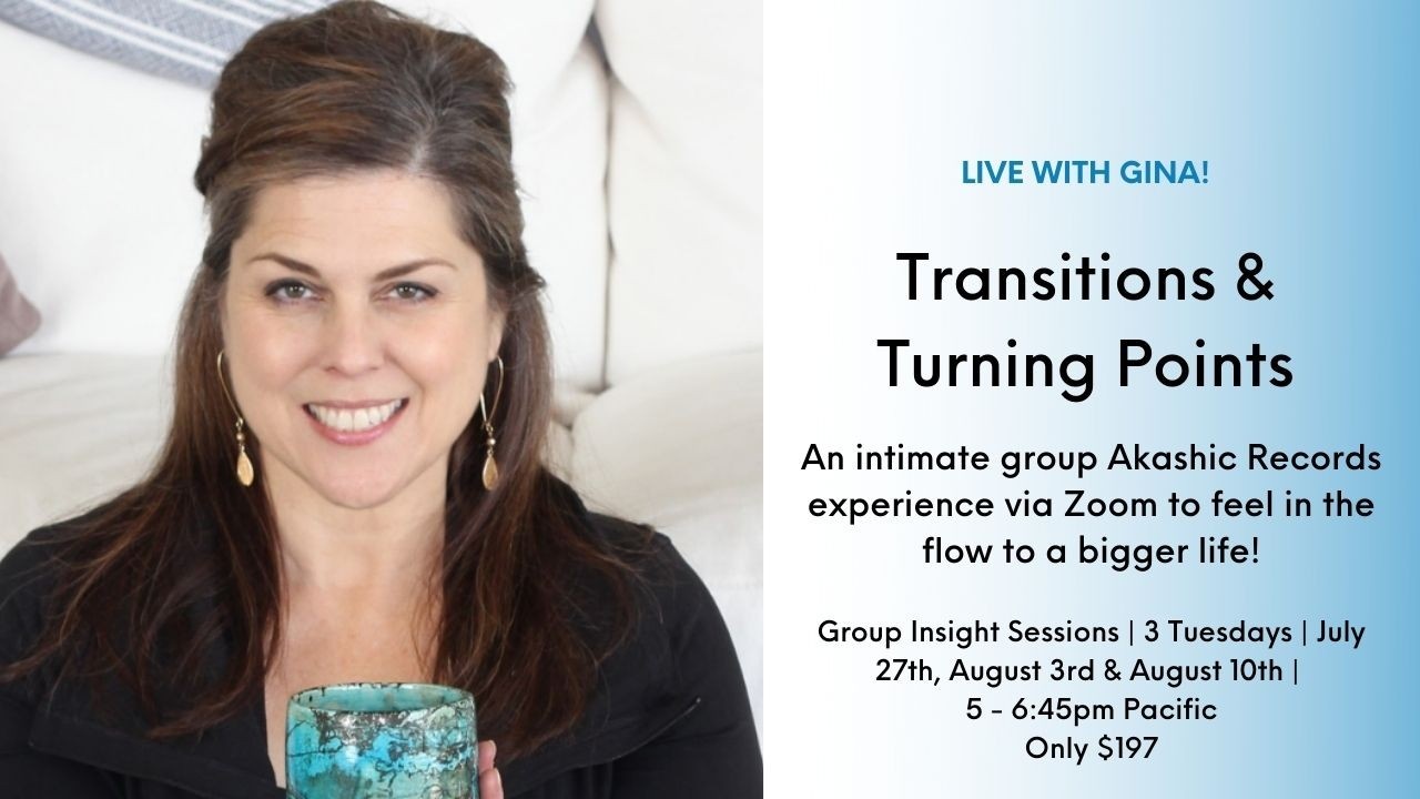 In this three-part group experience facilitated by Gina Airey (Advanced Akashic Records Practitioner and Master Healer) via Zoom you will be supported to navigate the transitions & turning points of your life and life’s work.